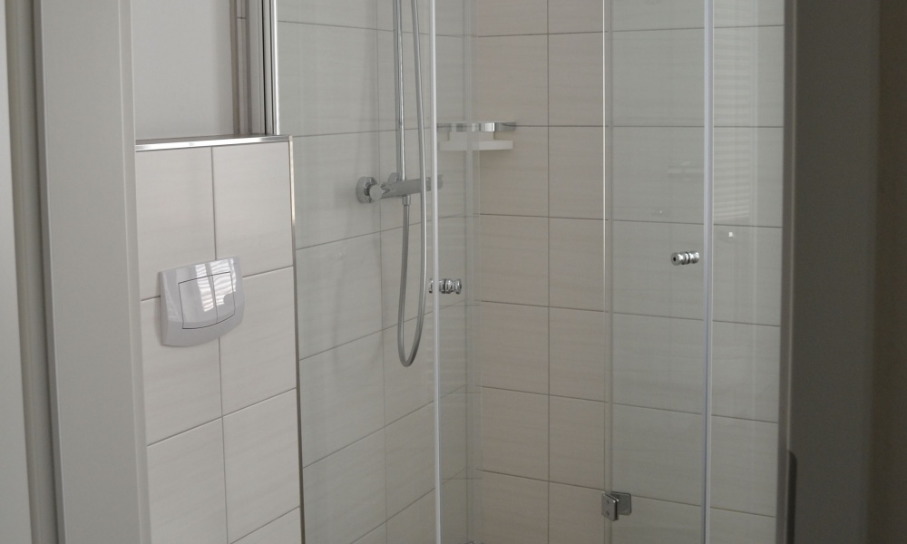 - Ein Badezimmer mit Dusche, Utensilien wie Fön natürlich vorhanden
